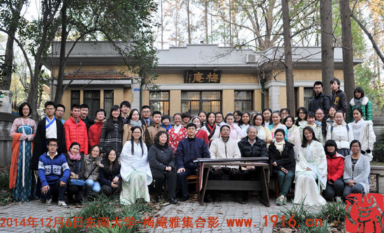 2014年12月6日下午,由大学生活动中心艺术团桐心琴社主办,艺术学院协办的“甲午年梅庵雅集”在四牌楼校区六朝松下的梅庵拉开了帷幕。艺术中心王世平老师,艺术学院王和平书记,桐心琴社指导教师老桐先生,梅庵琴派第四代传人、中国古琴学会理事、安徽省音乐家协会信息网络部主任、古琴专业委员会会长王丹(紫庐)先生,以及其弟子蔡亚运,安徽文达信息学院何广西老师,南京师范大学、南京邮电大学古琴社指导老师顾林瀚,南京大学琴社,我校曲钢老师、艺术学院刘江老师,近五十人济济一堂会聚于梅庵。老桐老师做了古琴与修身、古琴进入高等教育的情况介绍。仪器科学院全轶先同学制作了梅庵琴人,计算机学院乔思语同学作了桐心琴社PPT。