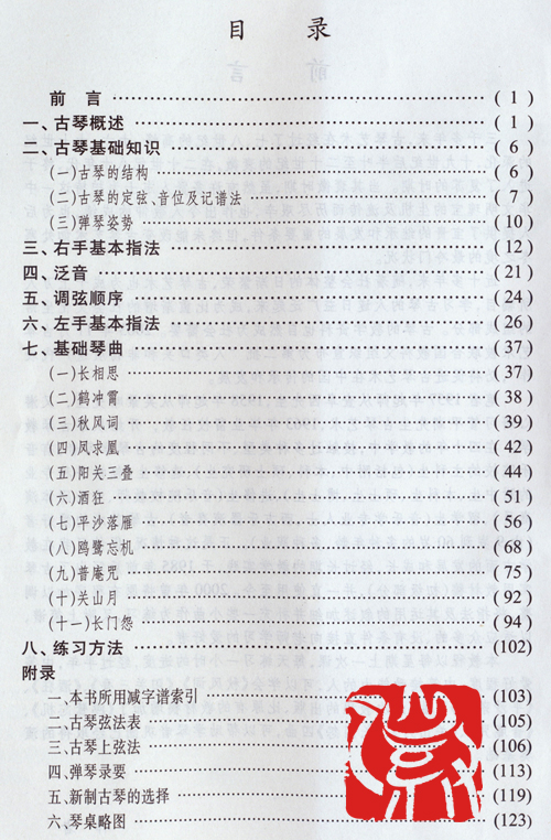 本教程以第星期上一次课,每天练习一小时的进度,经过半年,中等爱好程度、中等接受能力的人,可以学会《秋风词》、《阳关三叠》、《酒狂》、《平沙落雁》四曲。此次教程的出版,比原有的教材稿增加了《鸥鹭忘机》、《普庵咒》、《关山月》、《长门怨》四曲,可以帮助学琴者巩固已经取得的演奏基础。”