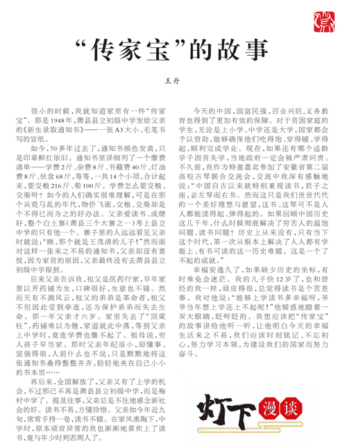 通知书详细列了一个缴费清单——学费2斤、杂费8斤、书籍费40斤、灯油费8斤、伙食68斤,等等,一共14个小项,合计起来,要交粮216斤、柴100斤。学费怎么要交粮、交柴呀?如今的人们确实很难理解,可是在那个兵荒马乱的年代,物价飞涨,交粮、交柴却是个不得已而为之的好办法。父亲爱读书、成绩好,整个白土寨——萧县三个大寨之一,考上县立中学的只有他一个。寨子里的人远远看见父亲时就说:“瞧,那个就是王茂清的儿子!”然而面对这样一张难得的通知书,父亲却没有喜悦,家贫上不起。早年我们家以开药铺为生,祖父是个医药行家,口碑很好,生意也不错。然而天有不测风云。祖父不是一个革命者,但他的弟弟是。祖父因此受到牵连,为保护弟弟而失去生命。那一年父亲才六岁。当家人突然走了,药铺没办法开下去,家道就此中落,等到父亲上中学时,竟连这学费也缴不起了。祖母说穷人孩子早当家。那时父亲虽小,但却懂事、坚强得很,人前什么也不说,只是默默地将这张通知书叠得整整齐齐,轻轻地夹在他那小小的书本里……