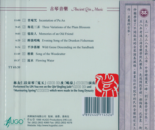 本CD由雨果制作有限公司出品,林友仁先生演奏,共7首乐曲,即: [1] 普庵咒 11:00