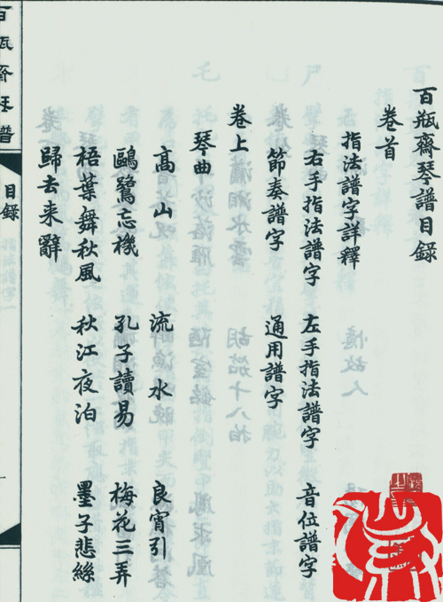《百瓶斋琴谱》有清“同治三年甲子秋八月松如弟江宗瀚拜题”序,有琴谱目录 、指法谱字详释、卷上琴曲10操,下卷琴曲11操,卷外琴曲三操。