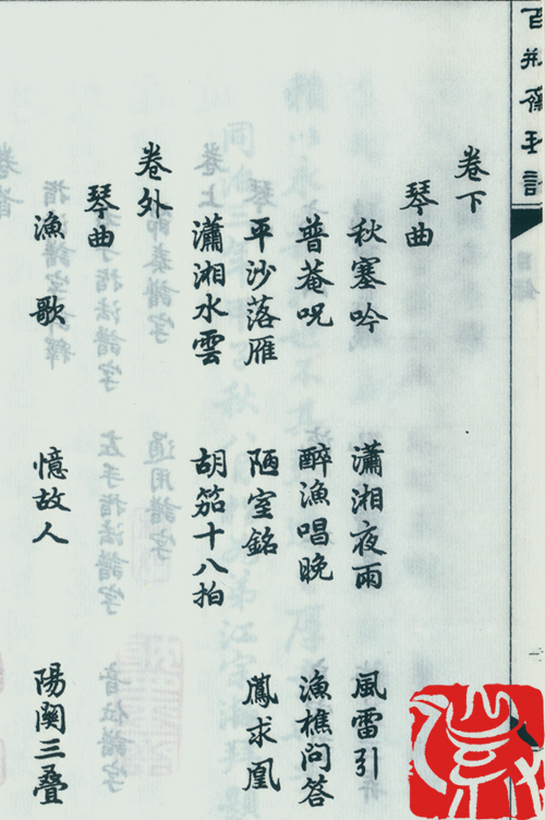 卷外三曲之由来,顾梅羹先生撰写于“公元一千九百六十年庚子冬月”之《百瓶斋琴谱·跋》前说:“先大父百瓶老人手订琴谱,缉于清咸丰六年丙辰,精楷亲书,计指法一卷,曲操二卷,曲目二十有一,嗣又增益《忆故人》一操,每欲付诸梨枣,不果。遗传于先父哲卿公、先叔卓群公,复收录《渔歌》《阳关》两曲”。顾哲卿也在丙辰(即1916年)春分后五日,在 “渔歌”曲终后说:“昨年时百回湘,与余兄弟过从甚频,时百于余之《潇湘》,余于时百之《渔歌》,辄彼此倾服不置,因交相授受,互留谱焉。”在《阳关曲》曲终说:“此本乃浦城祝桐君家藏秘谱,由张静薌刻之《琴学入门》,遂传于世。”说明此两曲得来于宁远杨百时、浦城祝桐君。