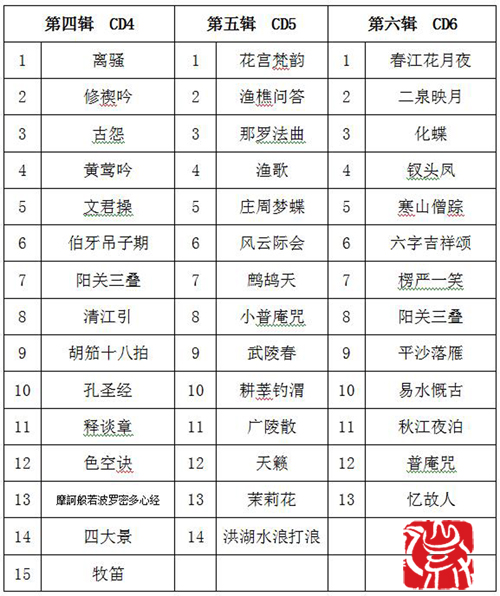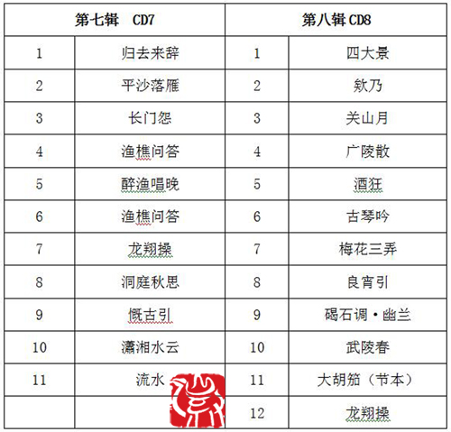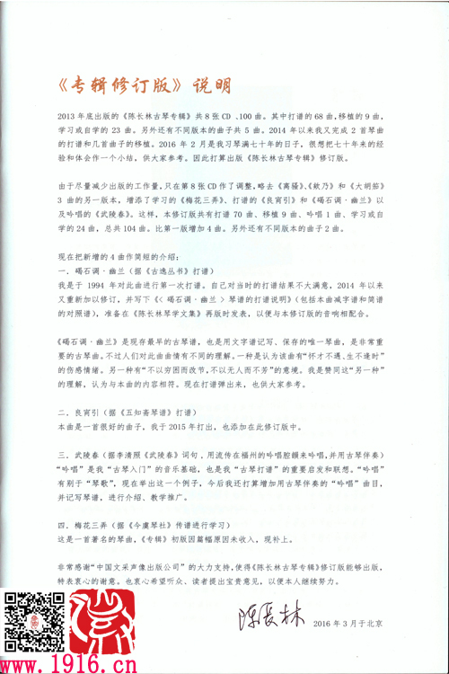 此次《陈长林古琴专辑》(修订版)中,打谱70曲、移植9曲、吟唱1曲、学习或自学的24曲,共104曲。比第一版增加了4曲。另外还有不同版本的琴曲2曲。