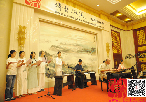 “清音·徽风”的古琴音乐会是合肥梅庵琴院组织的一场公益性演出,旨在纪念古琴大师查阜西先生诞辰120周年,同时纪念黄山丽田生琴台考12周年。有“琴坛徽骆驼”之称的梅庵琴派第四代传人王紫庐先生,在工作之余筹划如此盛大的古琴纪念活动,着实令人钦佩不已。身为一名梅庵琴人,我对这次盛会充满期待与憧憬。听王紫庐老师说,他敬爱的老师——查阜西先生的重要弟子、集科学家与古琴家于一身的八十四岁高龄的陈长林先生,中国昆曲古琴研究会会长、中国文史研究馆馆员、全国政协委员、著名学者田青先生等都将从北京远道而来。久闻其名的吴门琴家吴光同、吴明涛父子及笛子演奏家杜如松的弟子吴大伟先生等也将赶来同庆。这对沉寂多年的地方古琴界来说,无疑是一次盛大雅集。而且,整场音乐会分文不收,爱心演出,没有任何商业活动,这一日闻讯赶来的古琴爱好者济济一堂,其乐融融地会聚于稻香楼的桂苑小礼堂。