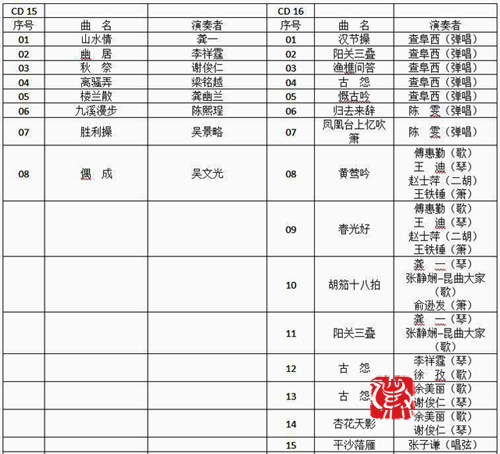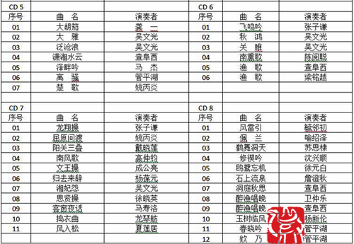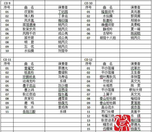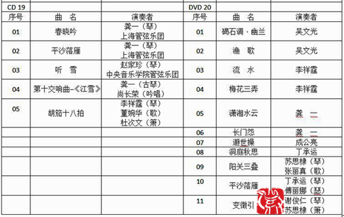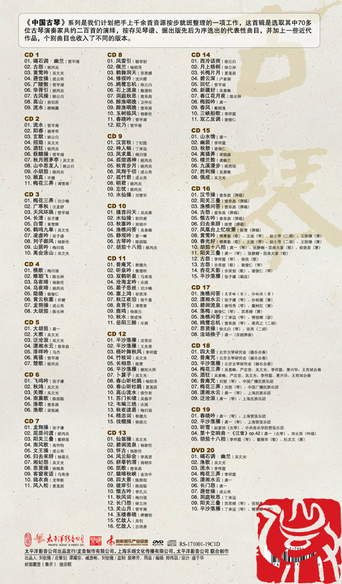 这套龙音公司的《中国古琴》专辑,习称“大古琴”,包括19张CD、1张DVD,约200首琴曲。这些作品分别由现代与当代七十多位琴人演绎,有独奏,有合奏,有琴曲,有琴歌,形式多样,洋洋大观。唱片为金蝶,限量1000套,做工精良,图文并茂,一本琴乐大雅集,一本文集,内容极其丰富多彩,其中很多珍贵作品还是第一次呈现在世人面前,可谓十年磨一剑,因此值得一听一阅。(王紫庐)