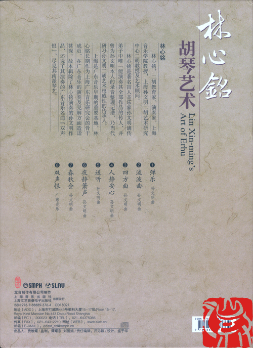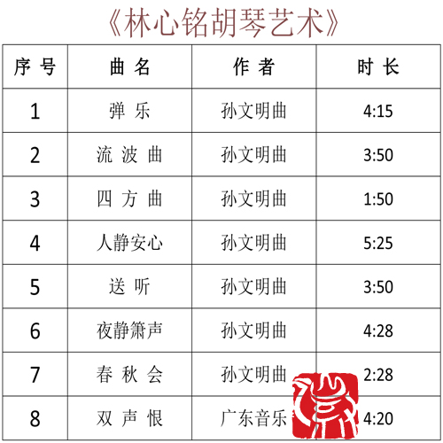 上海市广东音乐早期的重要基地,林心铭长期作为上海广东音乐研究会的骨干成员,在广东音乐的演奏及见解方面造诣甚深。故本辑除了林心铭演奏的孙文明作品,还选了其演奏的广东音乐名曲《双声恨》,尽见其南派琴艺。