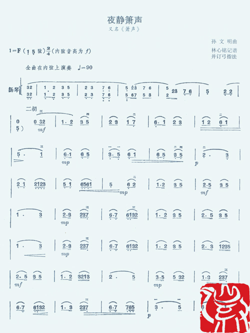 林心铭是著名盲人音乐家孙文明嫡传弟子中唯一能演奏其全部作品的传人,并曾为孙文明本人的录音整理记谱,乃当代研习孙文明二胡艺术权威性的传承人。