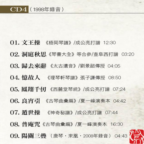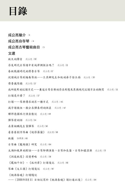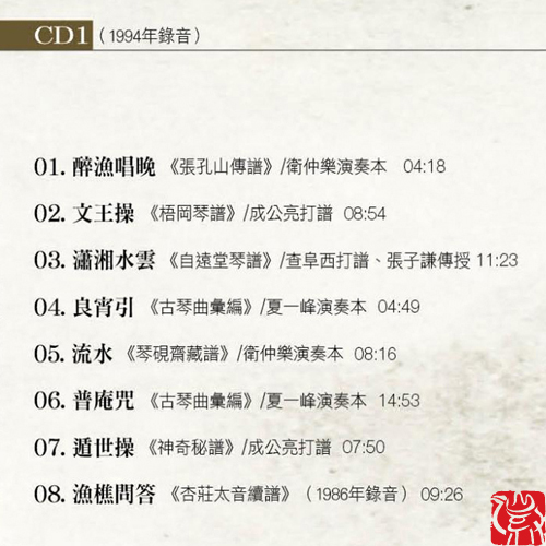 其“音像之部”涵括了13首成先生所师承或依据他人打谱、演奏本演奏、并于不同年代录制的30条录音;7首先生自己打谱的琴曲,共20条录音;创作作品有1部套曲共8首及3首独奏曲,2首改编曲,还有9首古琴与不同艺术形式合作的即兴作品。共计64首乐曲音频和11首乐曲视频。