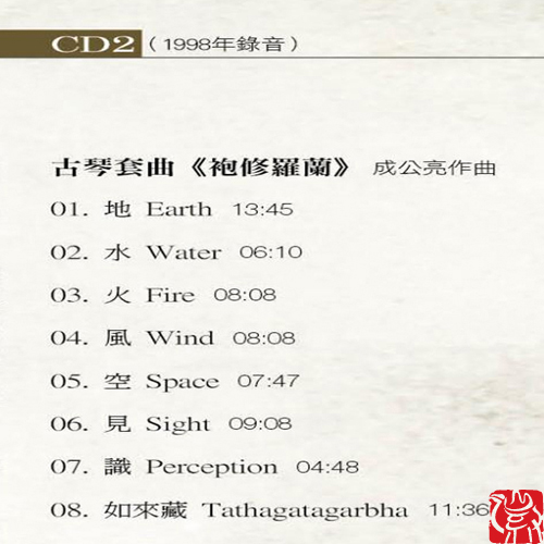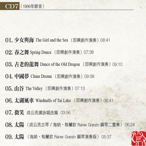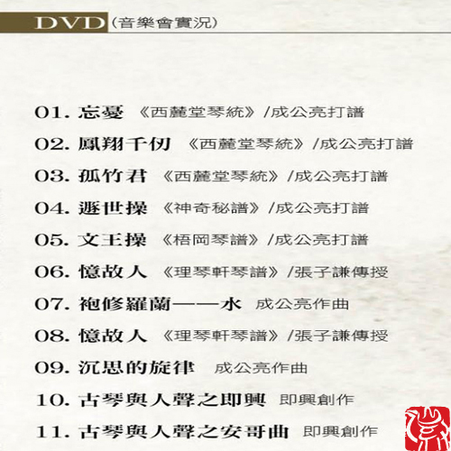 其中1首依人声吟咏改编的《微笑》为首次出版,6首即兴作品在国内首次出版,1首亦为初版的钢琴与古琴二重奏《太阳》,则是原钢琴曲作者海纳·格兰钦根据成先生改编同名钢琴曲的录音再度合作,完成了先生曾经的期待,而1996年他在香港音乐会的实况录像以及2011年与尼泊尔比丘尼琼英·卓玛合作出演的“古琴与梵呗音乐会”,亦将首次以DVD形式正式出版。