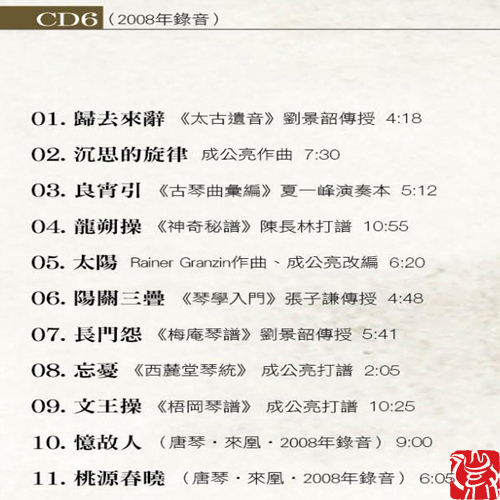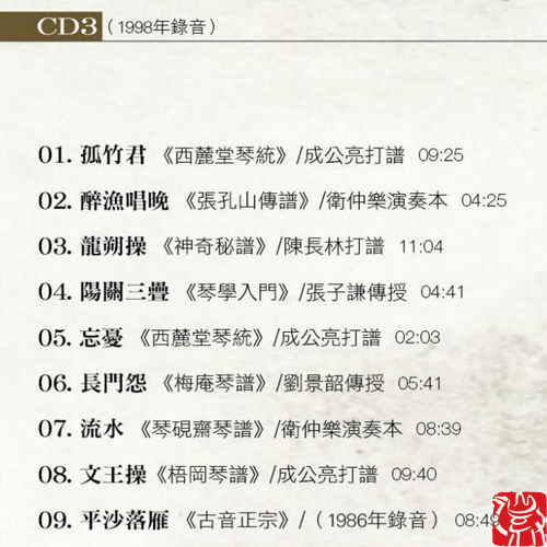 “因心以会之,盖将终身为焉”。面对《成公亮古琴艺术全集》,我不由再次感慨,当下琴界许多人用琴成就自我,而成先生却始终将自我奉献给琴。感谢龙音公司的这份厚重而珍贵的出品,如果一位学生,认认真真地听完这套全集,他/她会发现,成老师的琴乐在不同年代的变化。他/她不仅可以听到一个琴人如何在历时过程中“心与指合”渐入佳境,如何形成自己特殊的风格;也可以听到先生是如何倾其一生鞠躬尽瘁、为琴传道;更重要的,是静下心来,想一想自己要走的道路。